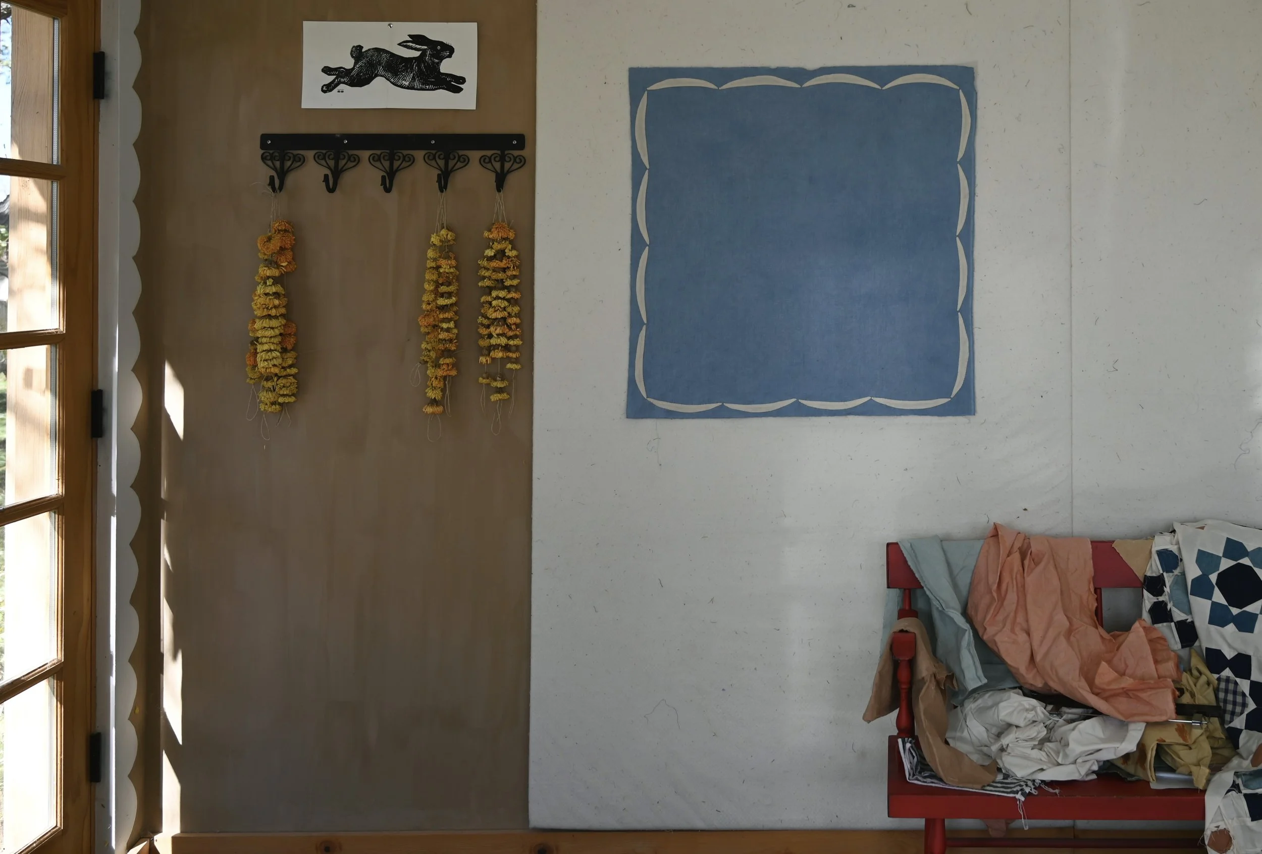 The bigger appliqué pieces were needle turned but the smaller pieces were left raw edge. I plan to frame this one so the raw edges will stay intact. The fibers used in this piece are mostly hemp and organic cotton. It was hand quilted with sashiko thread in a freehand allover method that sort of sums up our way of not having much of a plan and figuring things out as we go. The quilt measures 32” x 32”. It felt good to work on a personal piece that will be with us forever and perhaps even passed down when our time has come.