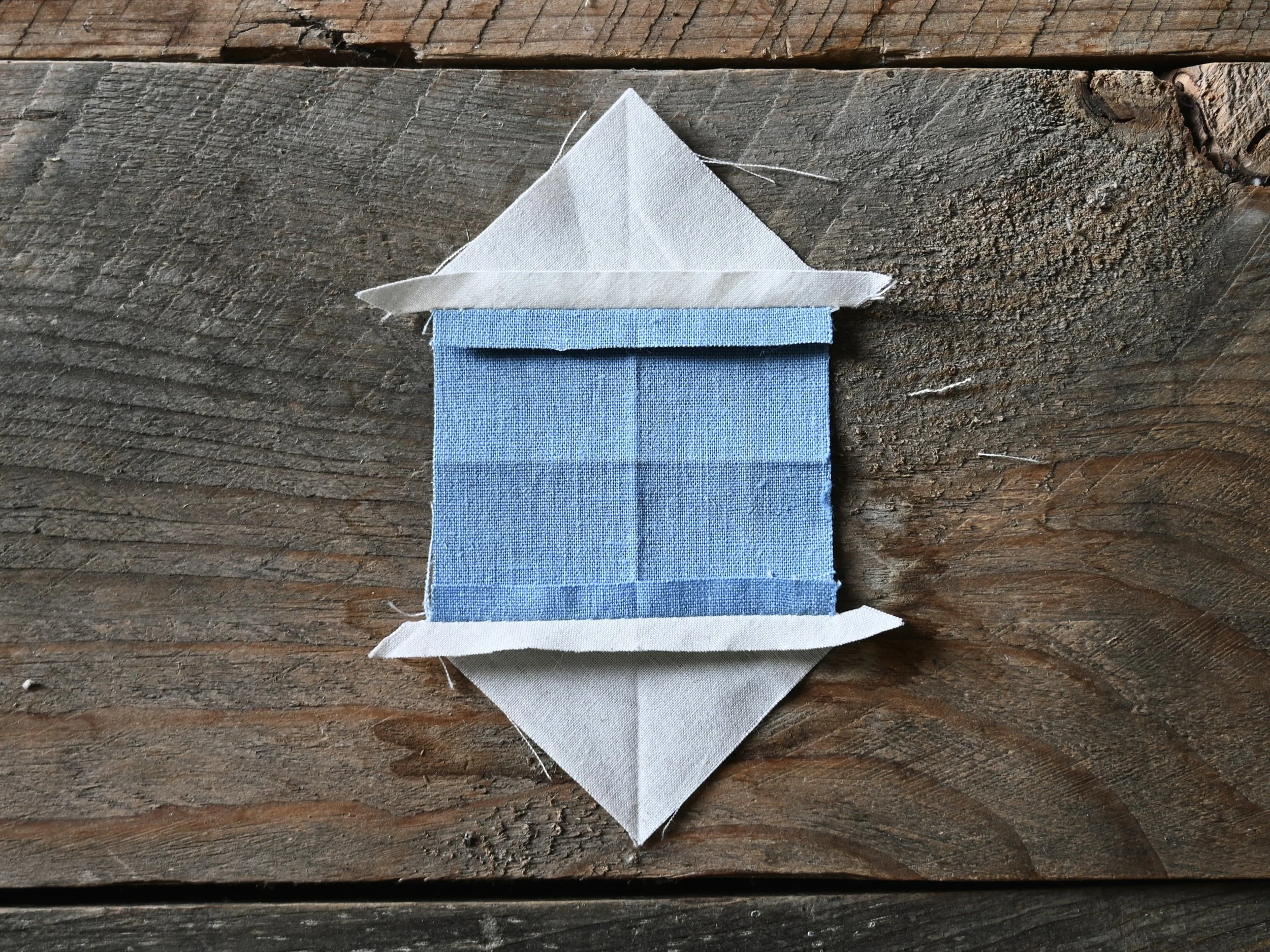 2) Nest an outer triangle’s crease into the crease of the center square as shown and sew them together using a precise 1/4” seam allowance.