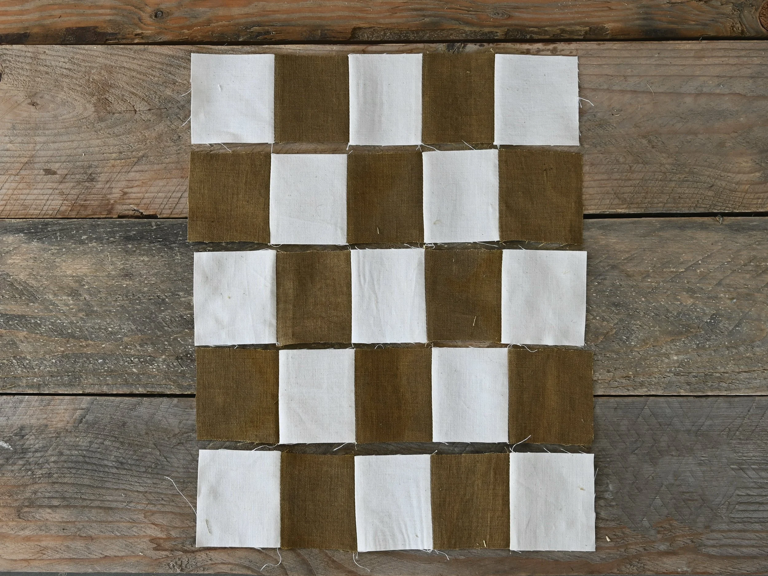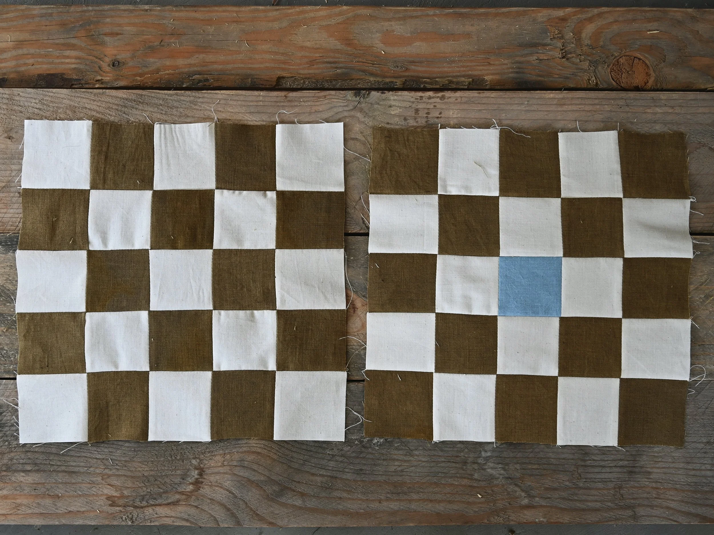 The finished size of this block is 12” (the unfinished size is 12 1/2”) because that’s what we’re working with in the Folk Sampler Sew Along. As with all quilt blocks you can change the size of the block by changing the size of the squares within which is explained above and also in this post. Throughout the following instructions I will refer to the colors as the ones I chose for my block shown on the left in 2 photos above: white, and olive green. As you plan your block, swap my colors for your personal choices.