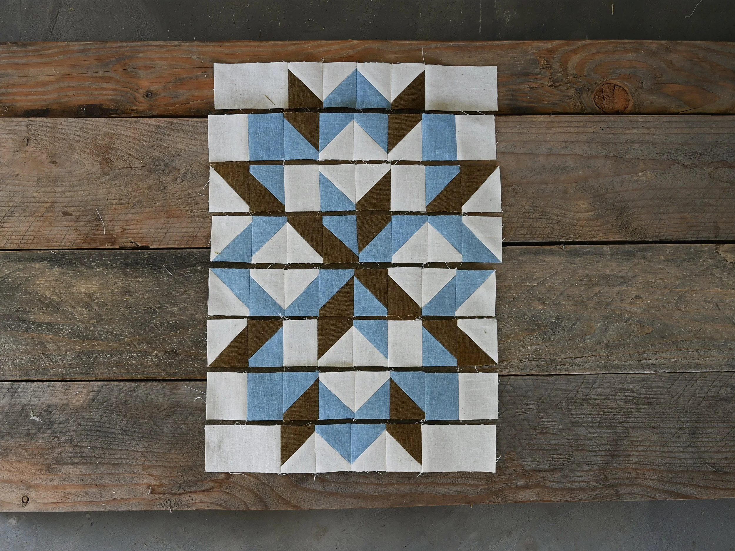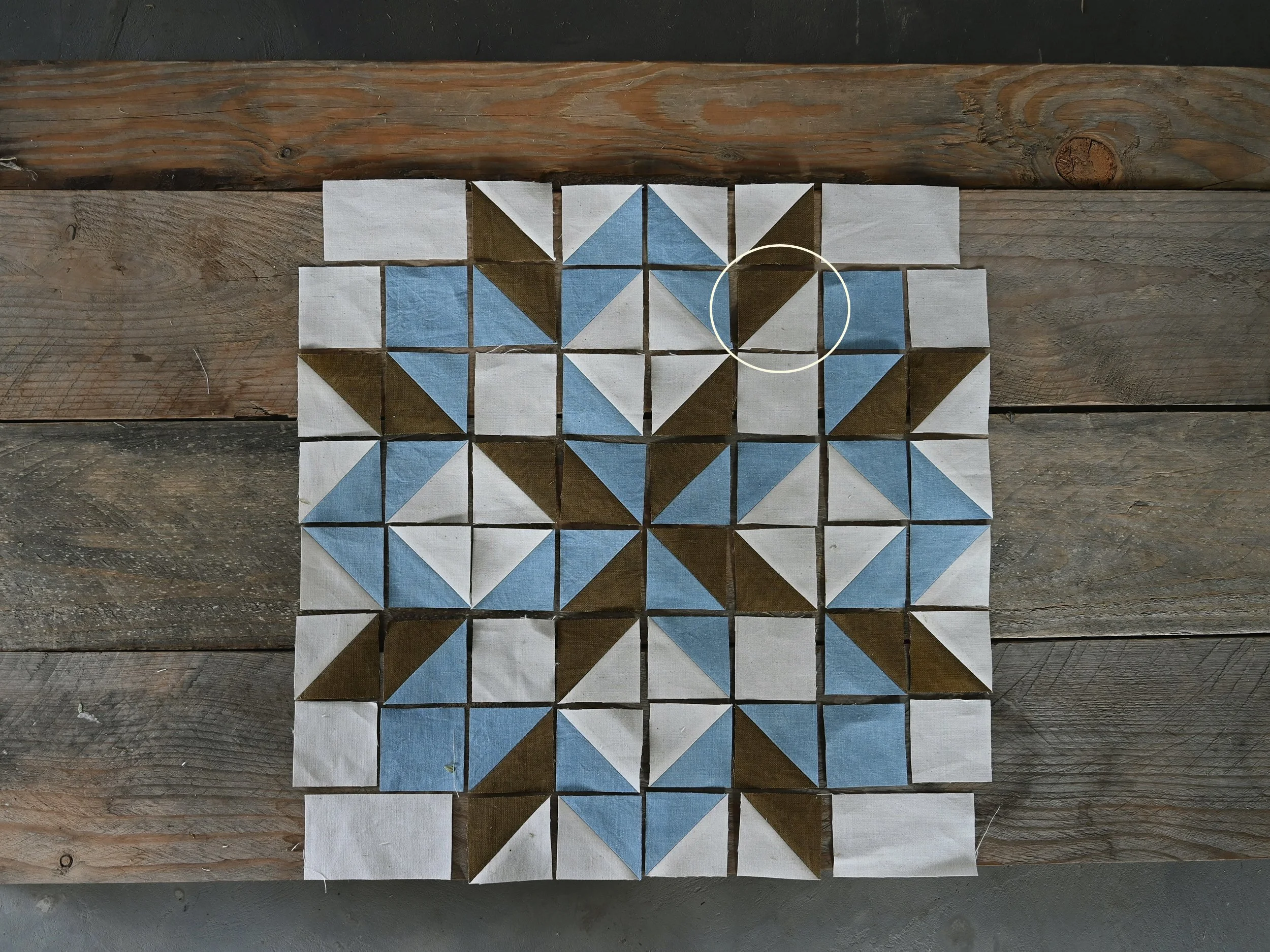 Arrange the pieces on your work surface as shown below. So many pieces right?! I made a mistake when constructing my block! The circled HST should be color 2 (olive) and color 3 (light blue) not olive and white.