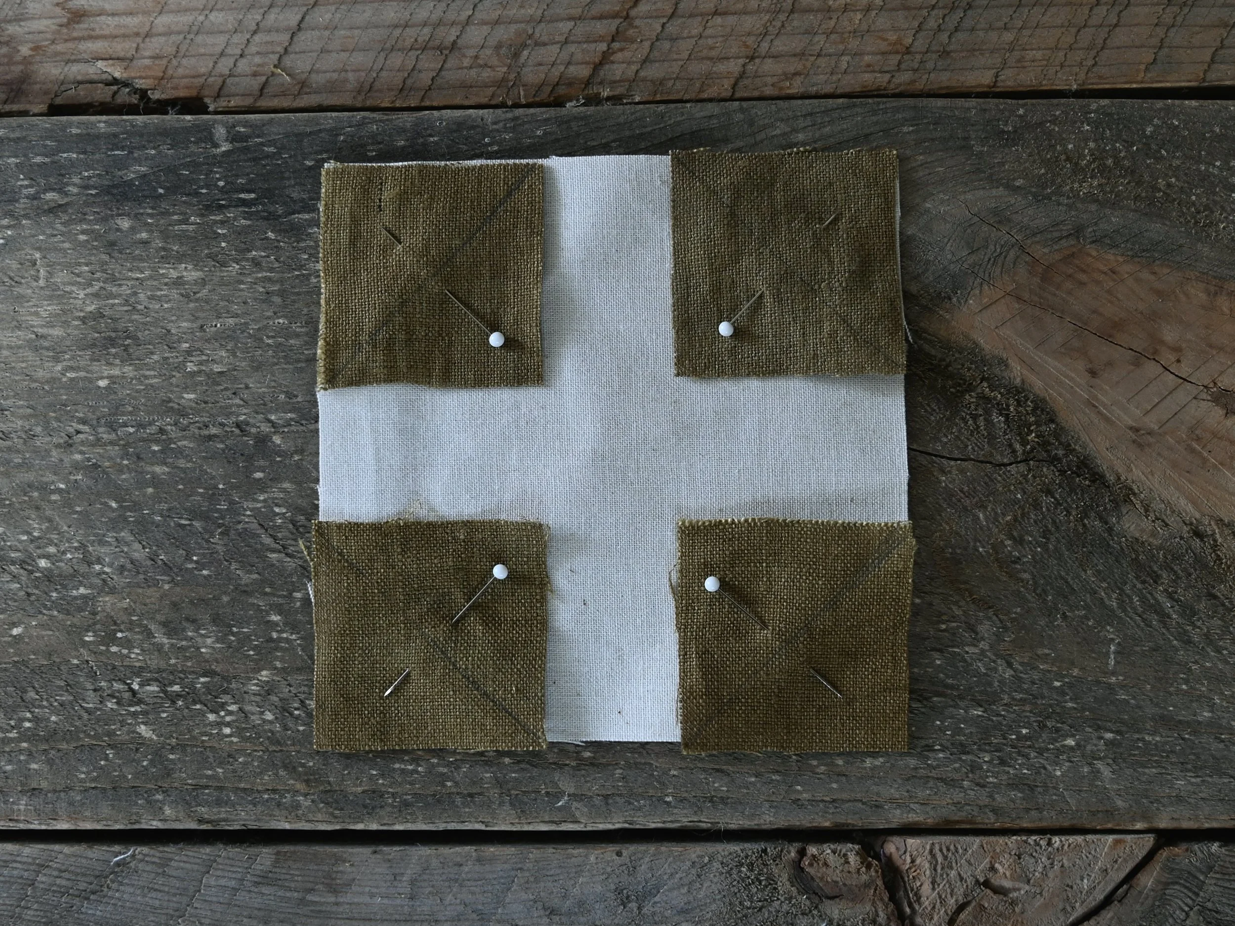 Pin a small square in each corner of the large square orienting the diagonal lines as shown below.