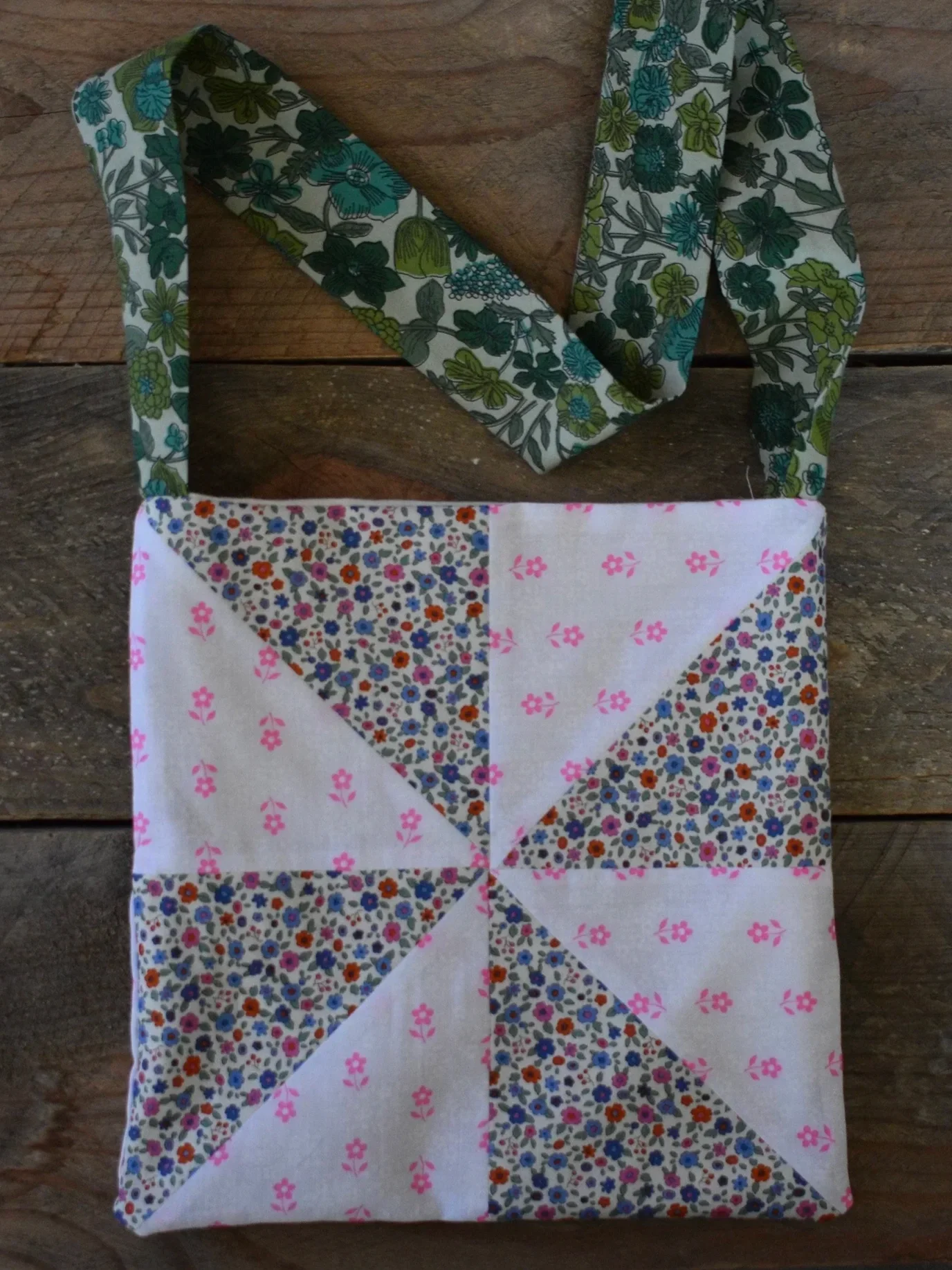 This handmade bag is sewn from naturally dyed and vintage print fabrics. It’s machine pieced and has a lining. Both sides of the bag are the same.
